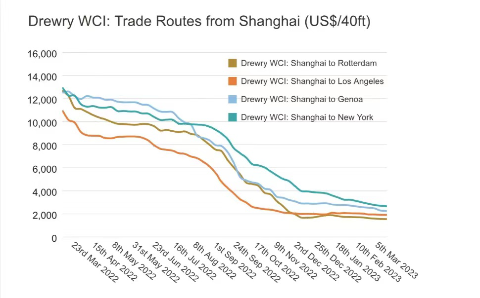 The latest Drewry WCI composite index of $1,790 per 40-foot container is now 83% below the peak of $10,377 reached in September 2021. It is 33% lower than the 10-year average of $2,691, indicating a return to more normal prices, but remains 26% higher than average 2019 (pre-pandemic) rates of $1,420.