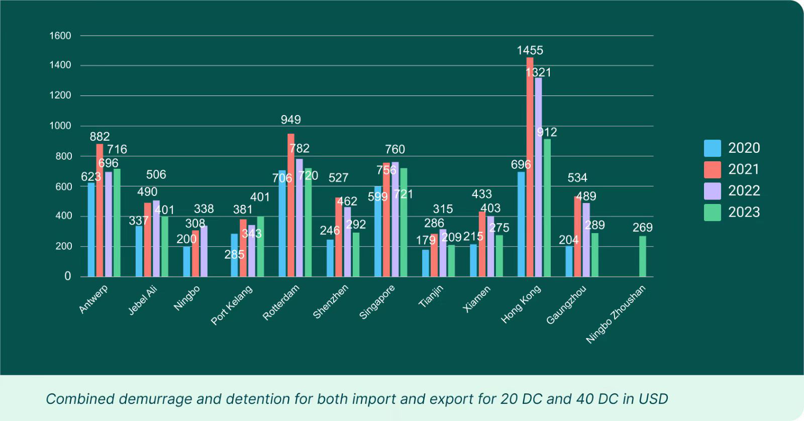 However, there are still 11 ports where Demurrage and Detention fees remain higher as compared to 2020. These ports include Antwerp, Jebel Ali, Ningbo, Port Kelang, Rotterdam, Shenzen, Singapore, Tianjin, Xiamen, Hong Kong, and Guangzhou.