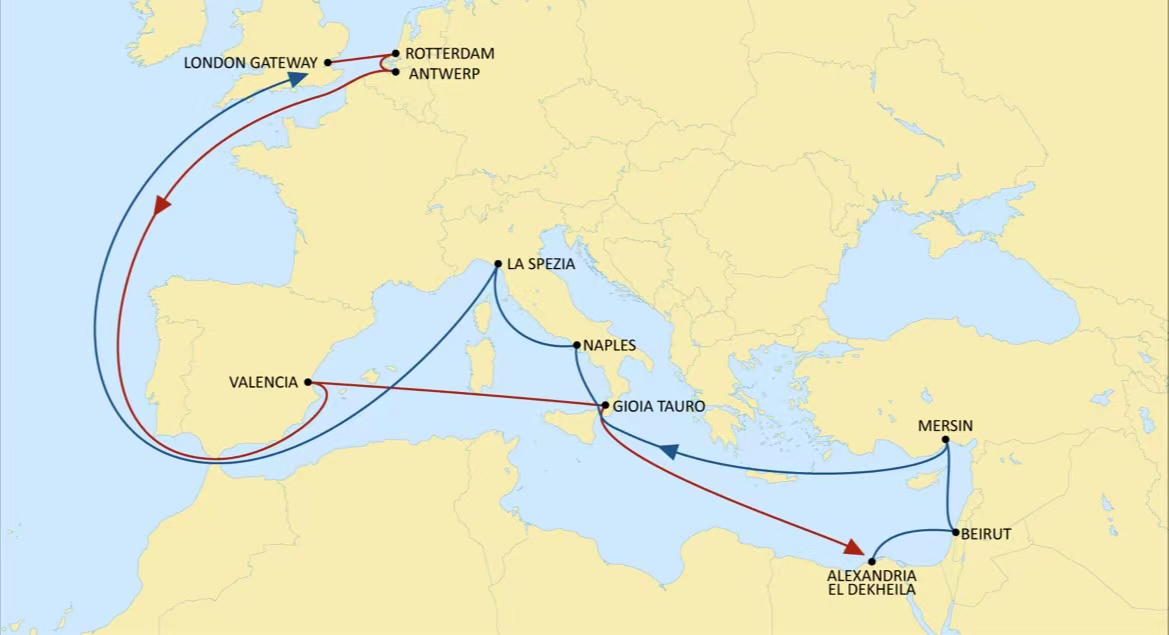 London Gateway (UK) – Rotterdam (Netherlands) – Antwerp (Belgium) – Valencia (Spain) – Gioia Tauro (Italy) – Alexandria El Dekheila (Egypt) – Beirut (Lebanon) – Mersin (Türkiye) – Naples (Italy) – La Spezia (Italy )– London Gateway