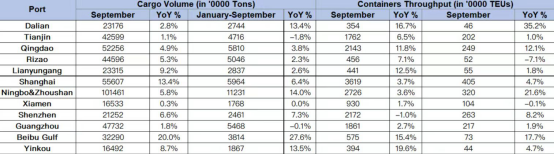 At the same time, the port of Yinkou reported the largest year-on-year container percentage increase in the first nine months of the year with its box throughput growing by 19.6%.