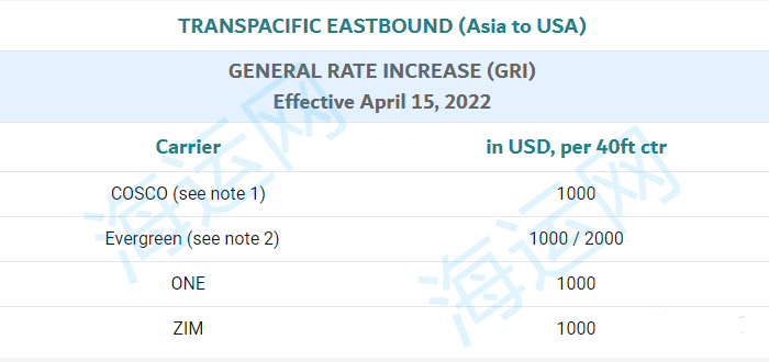 Note 1: COSCO GRI only applies to all goods shipped under a service contract. The GRI, which was previously in force on February 15, 2022, has been delayed until March 15, 2022, and subsequently until April 15, 2022.